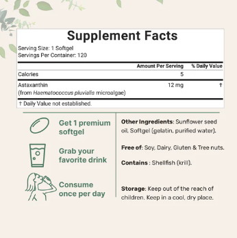 It’s a high-potency antioxidant supplement made from Haematococcus pluvialis microalgae, delivering 12mg of natural astaxanthin per softgel to support skin, eyes, joints, and overall wellness.